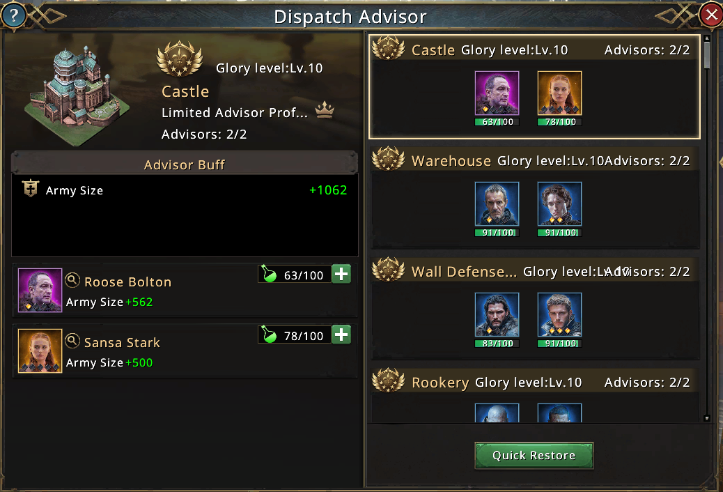 When assigned to buildings, Advisors boost functions specific to that building. For example, if you assign Sansa Stark to the Castle, she increases your army size. Similarly, Advisors can be attached to commanders to boost the battle formation’s stats and add unique skills.