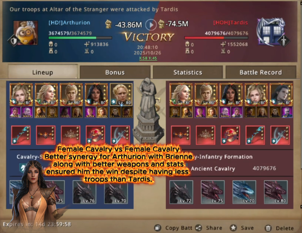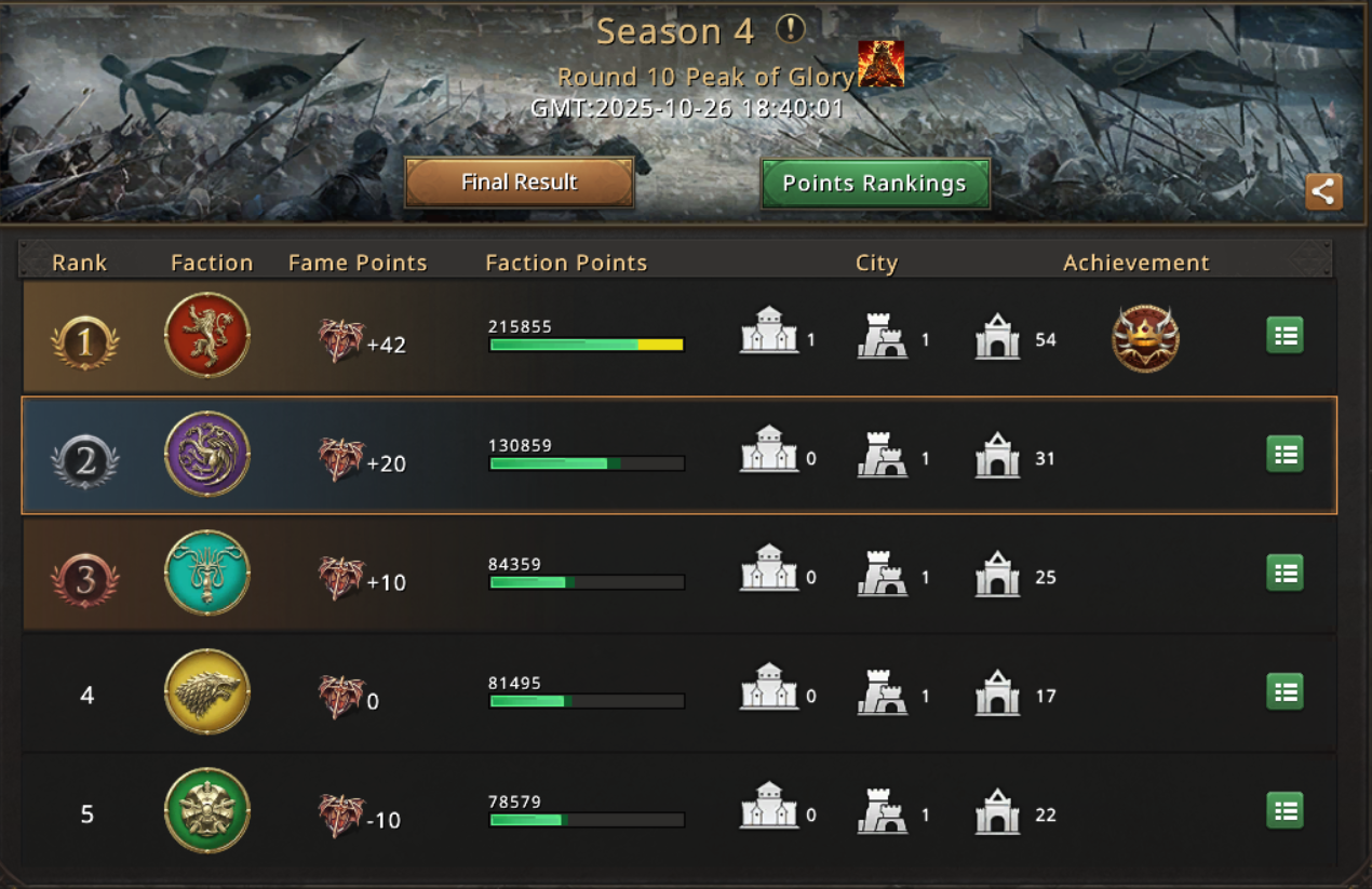 As expected, the House Lannister took lead, with ImperialRock kicking the neutral NPCs out with a swift solo attack. and he quickly got reinforced by his team. Despite knowing there's not much chance into defeating them, every house sent their strongest rally leads to challenge ImperialRock to a fight. Daenerys sent Arthurion and Lady Arthena in the battlefield and their rallies quickly got reinforced by the rest of team members and in a matter of minutes they were marching towards the City of Glory together with rallies from the other houses. Once they arrived there, they noticed the impressive force that Lannister's had massed into defending the city. A fight of epic proportions took place on the vale where the City of Glory was located, with millions and millions of troops fighting on each side, sounds of the valyrian steel weapons clashing could be heard all over the battlefield and troops were falling quickly on both sides, turning the snow around the city in bright red. Despite ImperialRock's superior strength, the troop numbers were not in his favor and every rally managed to chip a bit of the troops there, but his team was also on point with the reinforcements so the fight for the city continued for minutes after minutes with no side willing to give up. Ultimately the raw strength emerged victorious over the numbers and the House Lannister managed to fully occupy the City of Glory with just a few minutes left from the round.