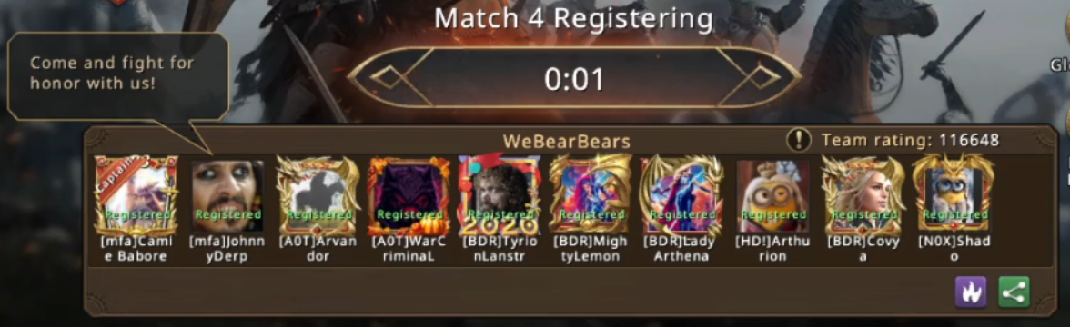As the Winter is slowly but surely approaching Westeros, the Season 4 of Arena of Honor is approaching its end quite quickly. For [N0X]Shado, the first 8 rounds were quite bad in terms of ranking but on the round 9 he finally found a good team and managed to get his first win of the season and for the round 10 he's looking to get the same result so he keeps slim chances of getting to the Glory King rank, but for now he needs a win to get to King and unlock more rewards in the Arena of Honor shop. He used the 2 weeks between the rounds to keep adapting his strategy and the gameplay to his new team, smelt more valyrian steel weapons for his troops and even managed to go and finish a quest that gave his dragons a new skill to use in battle. The time flew by, and it was already Sunday evening, so he took his most trusted commanders, his dragons and troops and head towards Arena of Honor battlefield and once he arrived there he met with the team and signed the pre-registration papers required for the team captain to register the team. Quickly after, the team got registered and then everyone waited patiently for the Old Gods to do their matchmaking.