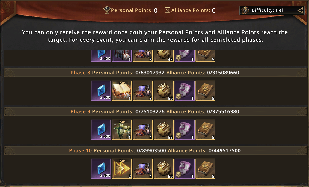 The above screenshot shows the rewards for the Easy difficulty level, but the rewards get better when your alliance starts playing in the increased difficulty levels. The toughest level of the event is Hell difficulty, and its rewards are as follows;