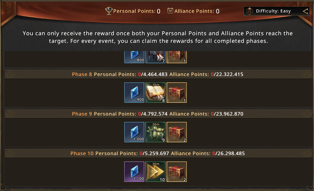 Every alliance starts playing the event in the lowest difficulty, which is Easy. There are 5 difficulty levels to be played; Easy - Normal - Hard - Nightmare - Hell. For your alliance to reach the next difficulty level, at least 25 members need to be successful with their defenses. If this number reaches 50 members, then your alliance can skip one difficulty and go for the next one. In other words; if you are playing in Easy difficulty and 50+ members are successful with defending, your alliance can play the Hard level next time the event is on!