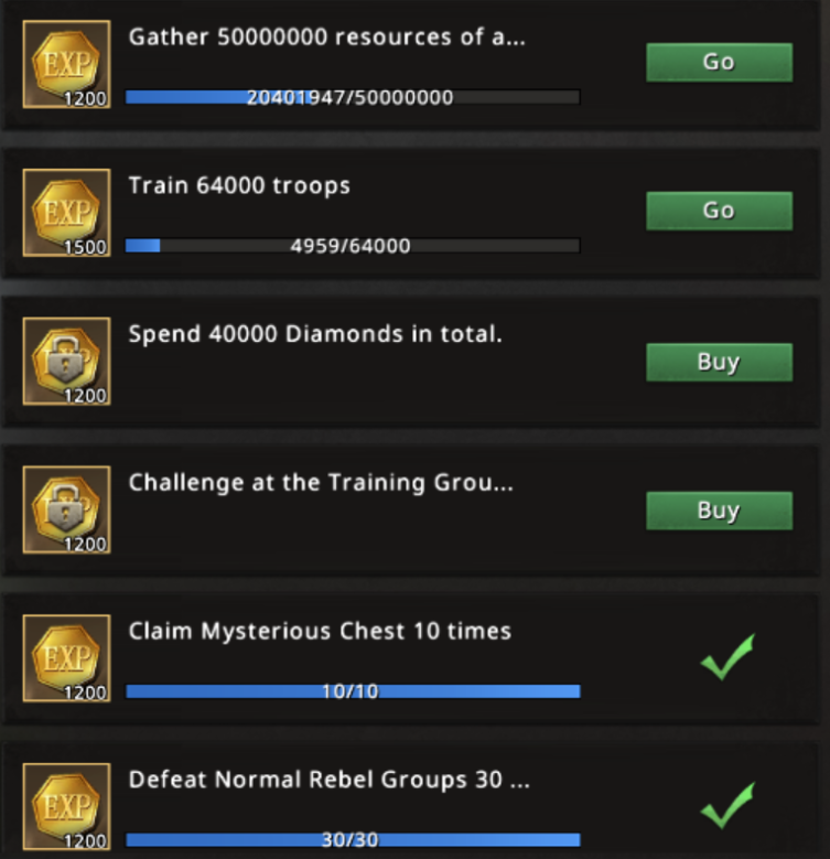 Like the previous section, this one contains a top 100 levels, and even after surpassing level 100, you will continue to receive additional rewards. To unlock this section, you need to use Black Diamonds, with a cost of 200 Black Diamonds. Upon purchasing this section, the remaining two quests will also be unlocked.