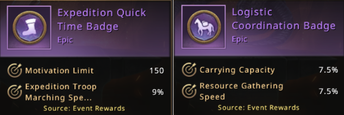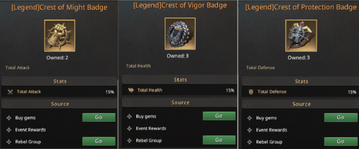- Total Badges - grant Total Attack, Health, or Defense across all troop types. Commonly rewarded in events like Ultimate Conquest, for example.