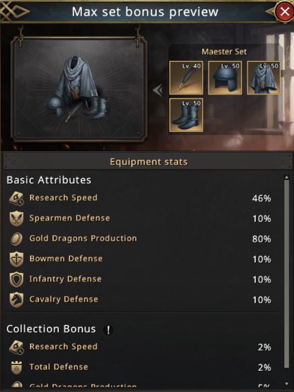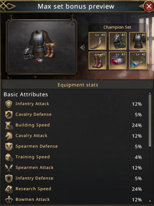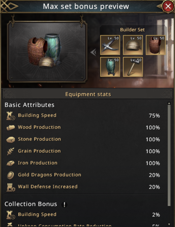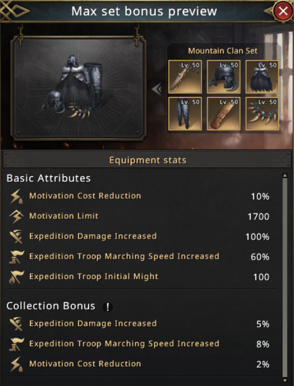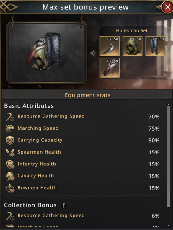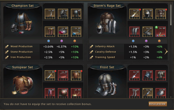 ➥ Collection Bonus - view passive bonuses earned from completing full sets. These boosts don’t require the gear to be equipped. Bonuses depend on the set - for example, Champion improves production, while battle sets improve troop stats and training speed.