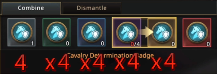 - Upgrade ratio: four lower-tier badges combine into one of the next tier (4:1).