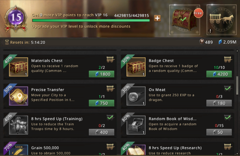 - VIP Shop - offers Materials and Badge Chests daily for blue diamonds.