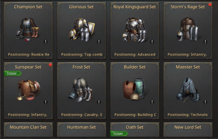 Once your core sets are complete, focus on battle equipment. Start by upgrading your regular battle gear to Gold, then mix in King’s Guard pieces. The final step is pushing your gear to Red with Battle Diamonds.