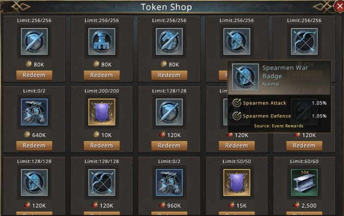 - War Badges - add both troop Attack + Defense; available in the Token Shop using Battle and Bravery Tokens from Champion City Siege.