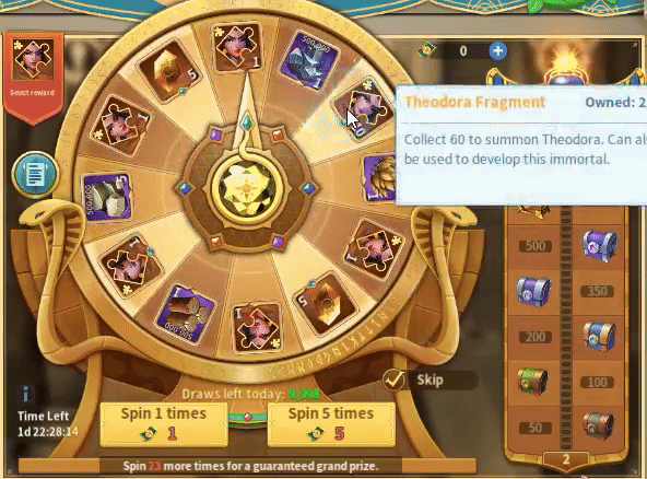 Patch 2.8.9 revamped Theia’s Roulette by cutting the Holy and Shadow Dragon Crystals in its two crystal slots from 100 down to 5, while adding more immortal shard slots, with five spots giving 1 shard and one spot giving 10. Even with these tweaks, Theia’s Roulette remains a poor source of immortals or Dragon Crystals, especially compared to Sparks of Galaxy, which can also be bought directly with Gems at a better rate (five Frosty Orbs for 1,000 Gems versus one Roulette ticket for 1,000 Gems). The occasional 100-crystal hit was the only real upside of the old version, and with that gone, there is now very little reason to engage with this event.