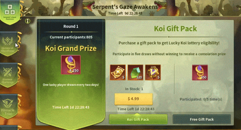Serpent’s Gaze Awakens is a ten-day Medusa-themed event running from Friday, November 14 to Sunday, November 23, replacing the usual November event. It features the Corridor of Ghostflame and Mt. Paradise castle skins in the Battle Pass, and overhauls monthly rewards by swapping the traditional featured castle skin grand prize in Dazzling Wish for 1,000 Eternal Grails. Players can also roll 5, 50, 100, and 500 Eternal Grails instead of Chaos Selection Chests and Random Chaos Fragment Shards, with similar odds. Eternal Grails are spent in the Grail Shop on Medusa, Anubis, Fu Fei, Poseidon, Nine Tails, Wukong, Loki, and Athena shards plus their exclusive artifacts, as well as smaller items like Stellar Core Crystals and Forging Stone Chests, though Ares and Apollo are notably absent. Since there is no expiration date on the Eternal Grails, you can save it for future events if they use the same currency.