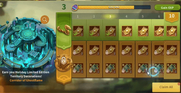 This event’s Battle Pass brought back two of the existing castle decoration skins in the Corridor of Ghostflame, which gives honor, and the Mt. Paradise skin, which gives faster marching speed. In my opinion, neither skin is as good as the other HP skins that give battle stats. Generally speaking, the additional Marching Speed is so minuscule that it doesn’t even matter much. Even when maxed, I would favor the skins with more PvP stats. There are two tiers of rewards and 30 levels to complete. The free tier offers a total of 30 Tokens of Light. The premium tier costs $49.99 and gives an additional 58 tokens, 60 Corridor of Ghostflame Fragments, and 30 Mt. Paradise Fragments. You need 60 fragments to craft one skin. Every development level requires a skin, so you would need 11 skins total.