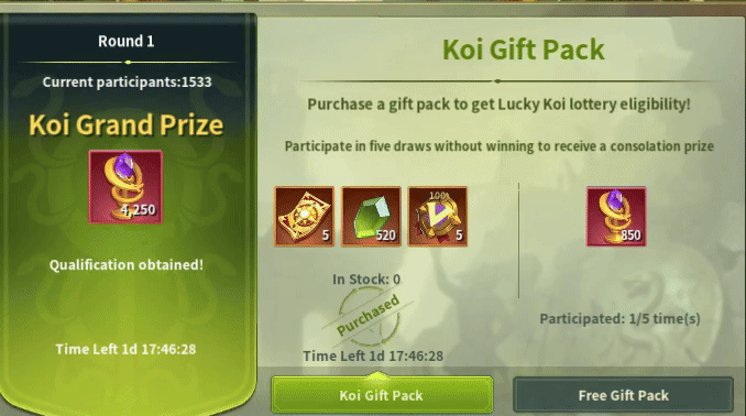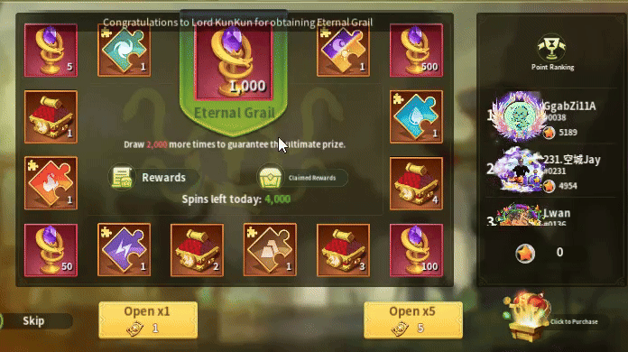This is the easiest part of the event. All players have to do is sign in every day, navigate to the event section, and claim rewards. Players can claim a Token of Light each day. These tokens do not expire and can be used for future events. Even if you do not have time to do every part of the event every day, this is a good opportunity to collect Token of Light for a little time invested, and allow you to try your hand at Dazzling Wish or save them for future events. In addition to the free sign-in rewards, this event follows the Panda Festival event to feature a lottery ticket system for players who purchase the Lucky Koi Gift Packs. The bundle costs $4.99 and gives five Tokens of Light, 520 Gems, and 500 VIP Points. This pack is significantly better than the double Gems pack from last month. Every two days, one lucky winner from all purchasers will be chosen to receive 4,250 Eternal Grails to use in the Grail Shop. The best part is, if you purchase the Koi Gift Pack five times and don’t win the grand prize, you will still receive 850 Eternal Grail as a consolation prize, which can be used to purchase 80 Chaos Immortal shards.