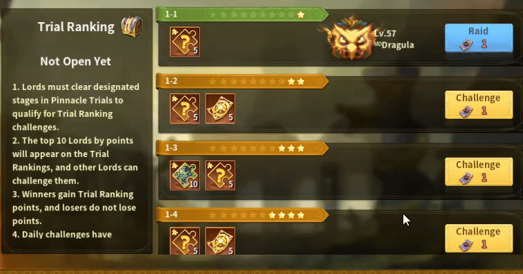 Pinnacle Trials are extremely similar to the Glorious Challenges except that players only get 1 attempt a day and cannot purchase additional tickets. The rewards are significantly better, too. There are five levels, and it offers gifts of 25 Random Immortal Fragments, 30 Mt. Paradise Fragments, and 10 Tokens of Light. After completing the levels, you can raid them to get additional rewards. The later levels are significantly more difficult since the enemies have legendary skills.
