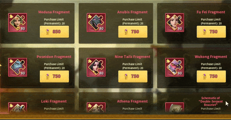 The Grail Shop is the newest addition to these monthly events. Players can trade in their Eternal Grails for a number of rewards. Chaos immortal shards include sets of 80 of Medusa, Anubis, Fu Fei, Poseidon, Nine Tails, Wukong, Loki, and Athena. Each can be purchased a total of 20 times. Medusa costs 850 while the others cost 750. You can also purchase their respective exclusive artifacts for 1,100 for Medusa’s and 1,000 for everything else. Players can also purchase lesser rewards like Equipment Forging Stone Random Chests, Stellar Core Crystals, Holy and Shadow Selection Chests, their artifact chests, and Random Territory Decoration Fragment Chests. The grails carry over to the next event as well, so the best value items are the Chaos shards.