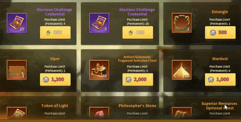 Players can trade in their Serpent’s Eyes for prizes. Everyone should aim to get all the important items, namely the 25 Tokens of Light, the Entangle avatar frame, the Viper chatbox, two Artifact Selection Chests, and 600 Stardust. The cosmetics and collector’s items will cost a total of 1,700 coins. The artifact chests cost 2,000 apiece. The Stardust costs 1,000 per 100. Tokens of Light will run for a total of 10,000 coins. The first 16 levels of the Glorious Challenges will net you 1,890 coins. The latter 16 will yield 3,670 coins. If you forgo the artifact chests, you can already get everything else and save Gems. Additionally, you can also purchase 100 Glorious Challenge tickets for 8,000 Gems. If you raid the last level of the Hard Mode, you can get 28,000 coins with 100 challenges. That’s enough for all of the essentials and then some.