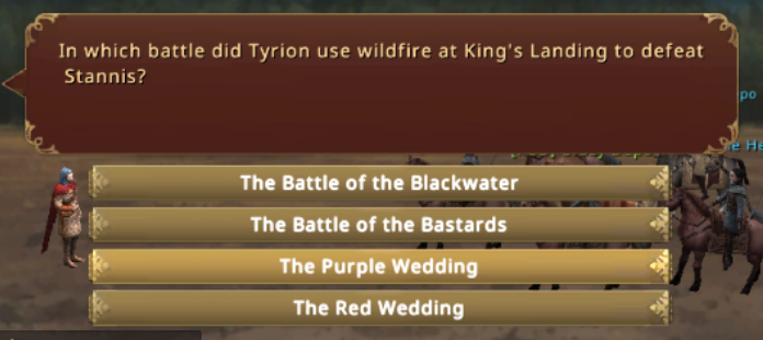 Was asked "Who used wildfire in battle of blackwater, We answered Tyrion. We were wrong, but then the next question was