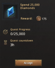 - Spend Blue Diamonds: The time available to complete this quest is much shorter - sometimes as little as 4 hours. The goal is to spend Blue Diamonds in one of the following amounts: 25,000, 50,000, or 100,000.