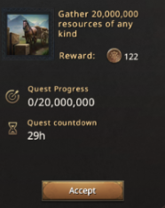 - A specific resource quest, which requires gathering a certain type of resource, such as “Gather 18,000,000 Grain.”