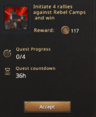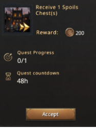 - Receive Spoils Chest: Once this quest is activated, you have between 24 and 48 hours to complete it. The task requires you to obtain a chest from a Rebel Camp. Important: If your Merchant Guild is already full of chests, you won’t be able to obtain another one to complete the quest. Make sure you have at least one free slot available before starting.