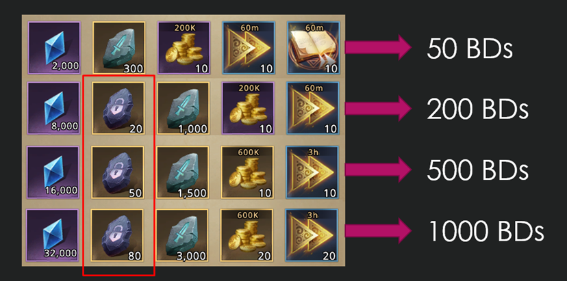 - Red premium weapon (e.g. Cersei, Jon Snow, Baelish, etc.) → 600