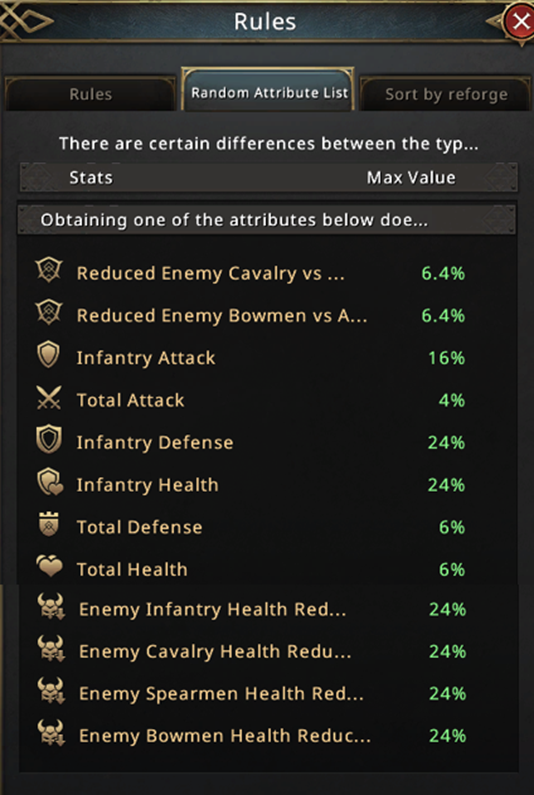 Enemy Health Reduction → Since many players nowadays play a mono troop type account, it also means that they keep their frontline’s health in the refinement, hence a very high Health attribute for the troops. It often makes it difficult to beat them sometimes. To overcome this issue, you can hold onto Enemy ‘troop type’ health reduction in the re-rolls. For example, if you play a mono Infantry account, you might wanna load up your weapons with “Enemy Spearmen Health Reduction”.