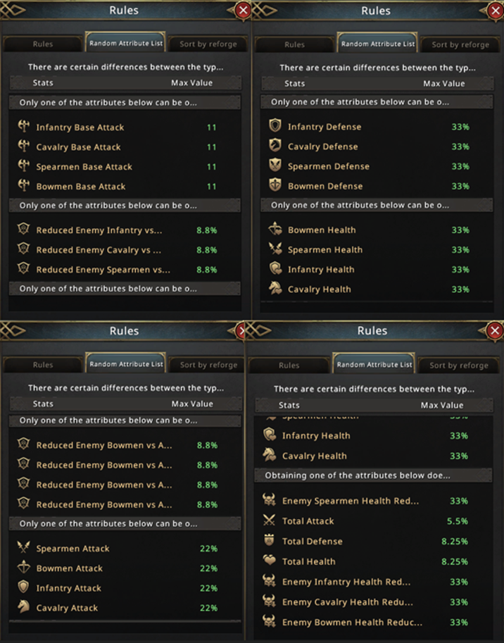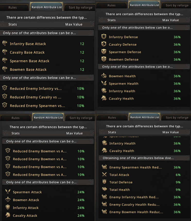 Similarly, Cavalry and Spearmen Gold weapons offer attributes on similar lines but with slight obvious differences. For example, Cavalry weapons give “Cavalry Attack'' and Spearmen Weapon gives “Reduced Enemy Infantry vs Allied Spearmen Damage”, etc. Red P2W and Red Premium have a wider pool of attributes, and they are slightly more powerful.
