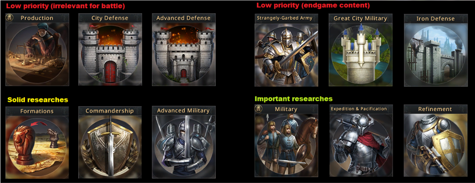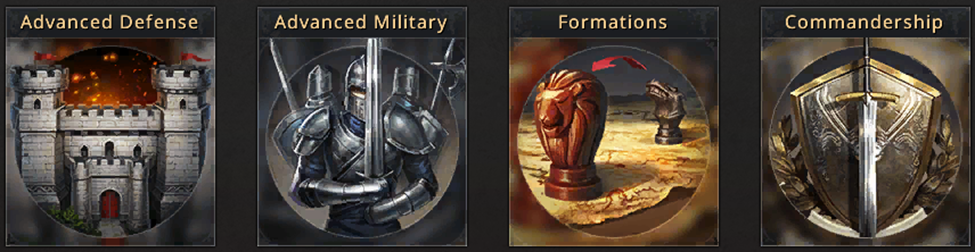The formations tree gives you access to different troop formations for attack and defense. Early on, it is only necessary to unlock the first two formations, which, when combined with the default one, cover almost all scenarios. The latter research is expensive and not a priority until much later.
