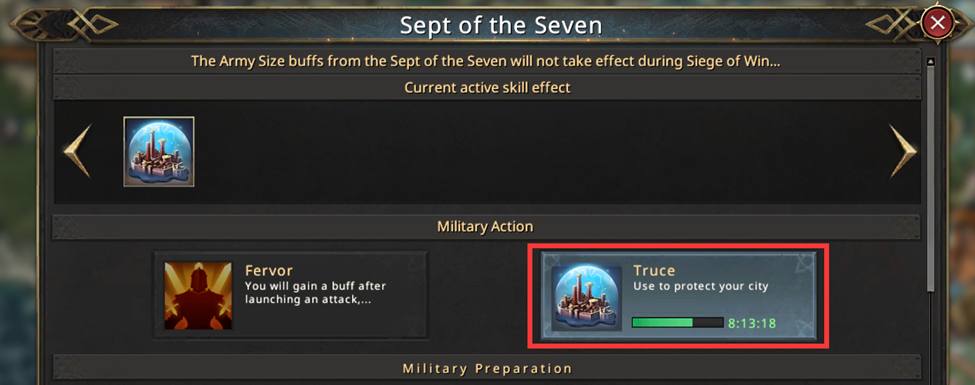 ● Whenever you are not fighting on the map use a truce from the Sept of the Seven to protect both your army and your resources. Truces can also prevent an ongoing attack on your castle if you do not have fervor. You may also appoint a friend as your protector, allowing them to activate truces for you when you are away or busy.