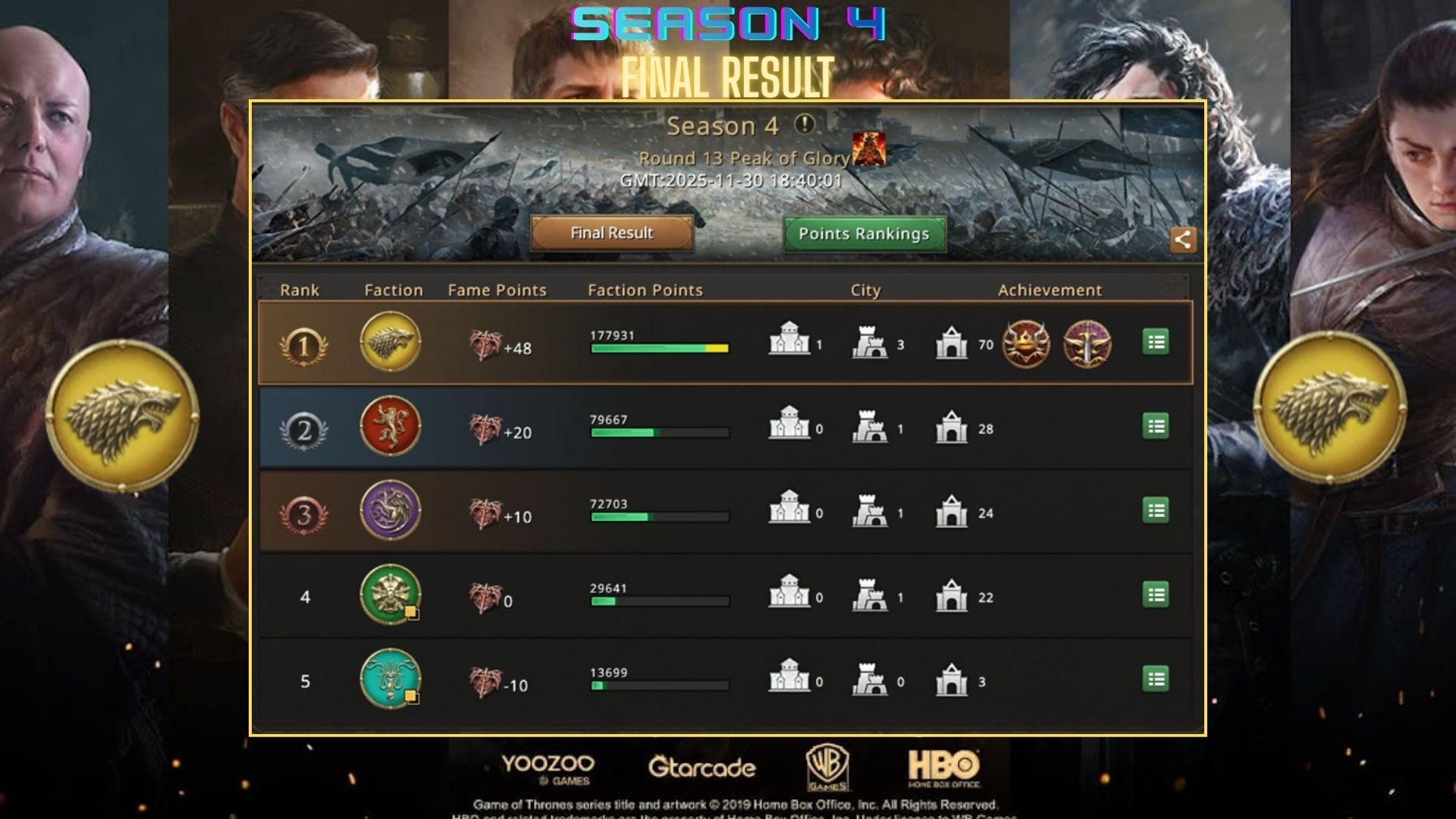 As the final minute ticked away House Stark celebrated a well-deserved win,” we won with a 100k points lead, this was the most dominant win I’ve ever had in Arena of Honor, thanks everyone for your support,” Moshow2 unfortunately was a few points short of King rank but he enjoyed his time in House Stark. “The offensive strongholds worked wonders against our opponents Clan Castles, I’m going to take that into account when deciding for or against this strategy again,” BjM learnt how powerful offensive strongholds could be but he still preferred the Trading Post route.