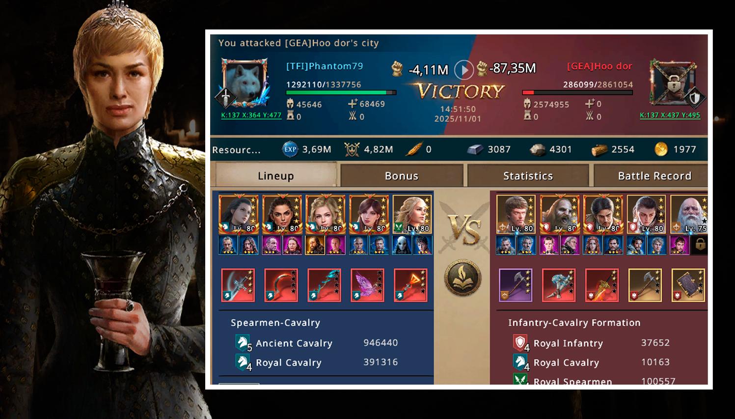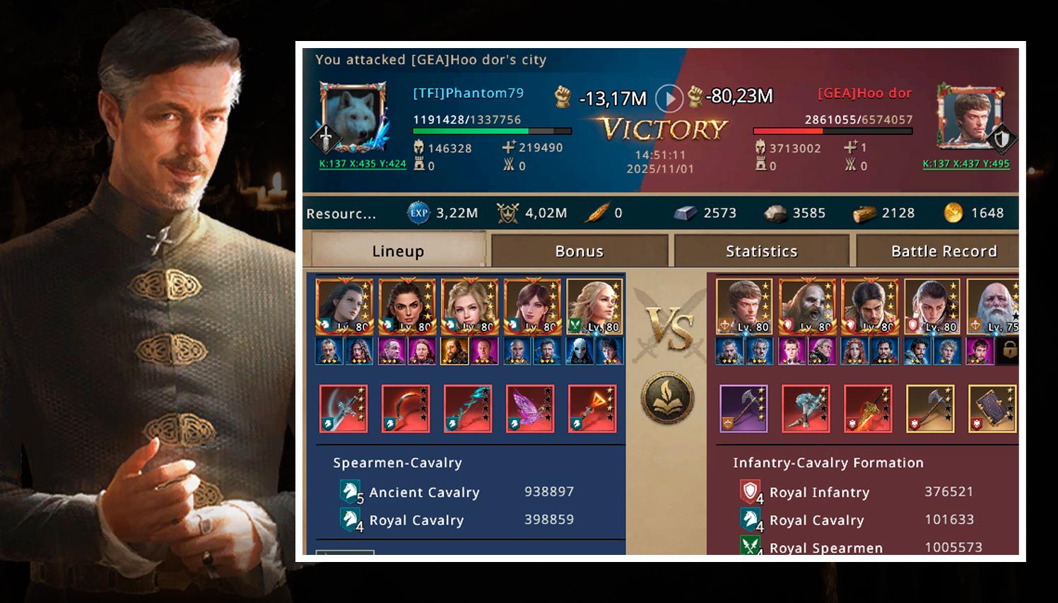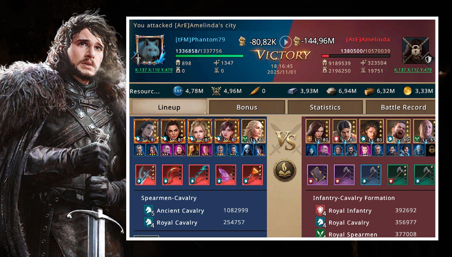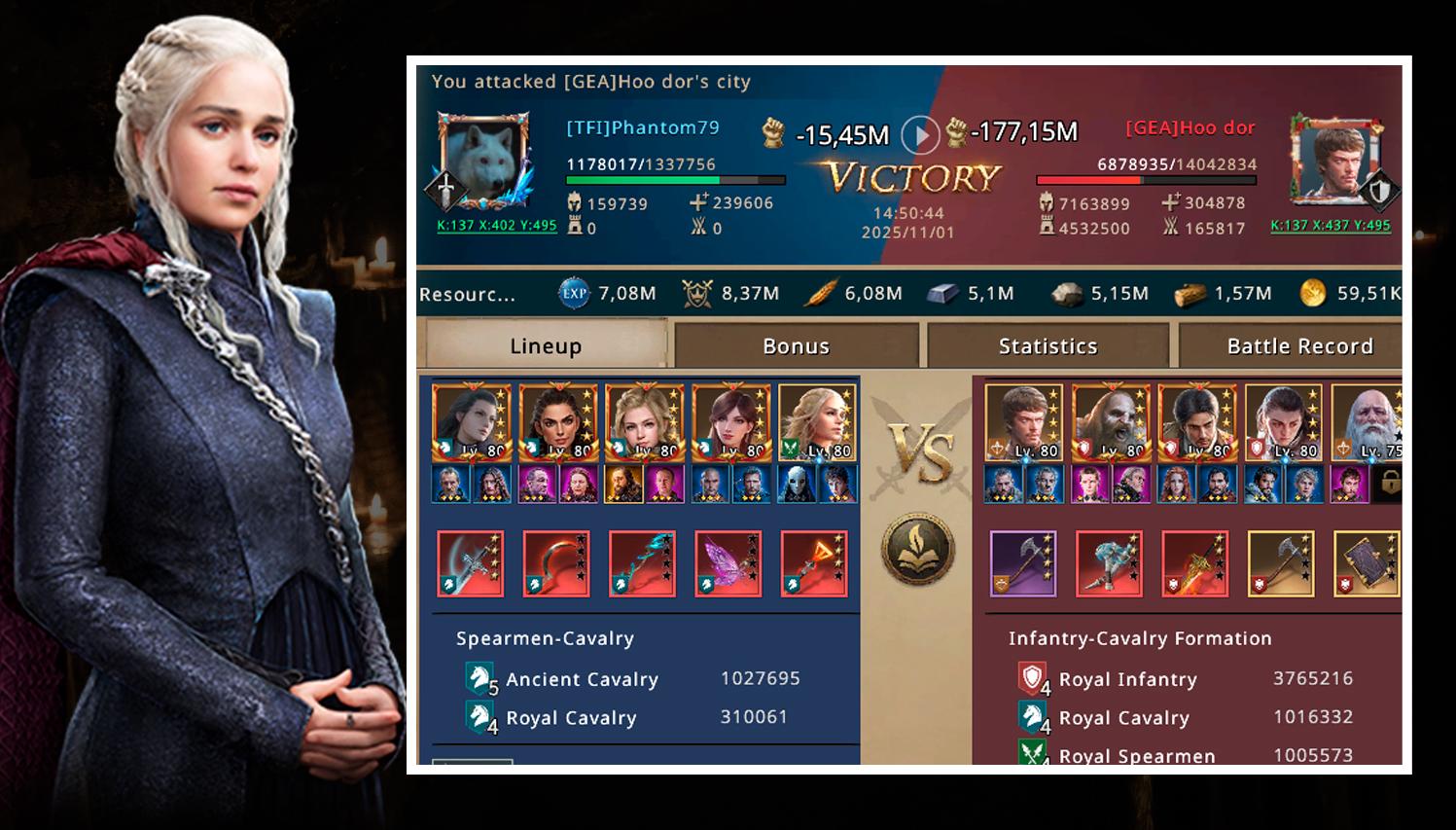 Phantom did not hesitate. His army moved behind him like a single shadow sliding over snow. When he gave the command, the first attack fell with brutal force. The walls cracked like thin glass. Hodor lost 7.1 million troops in the opening blow.