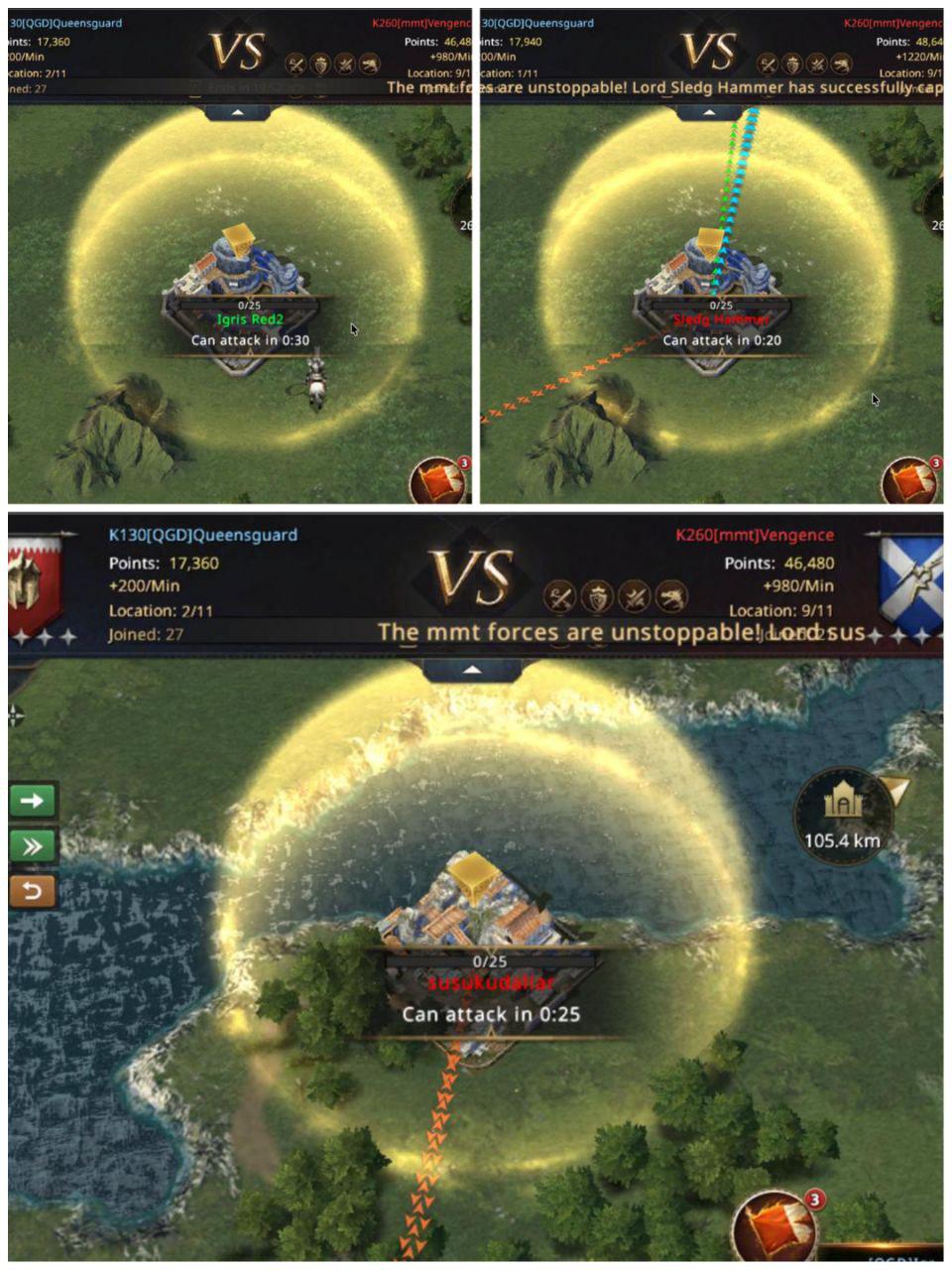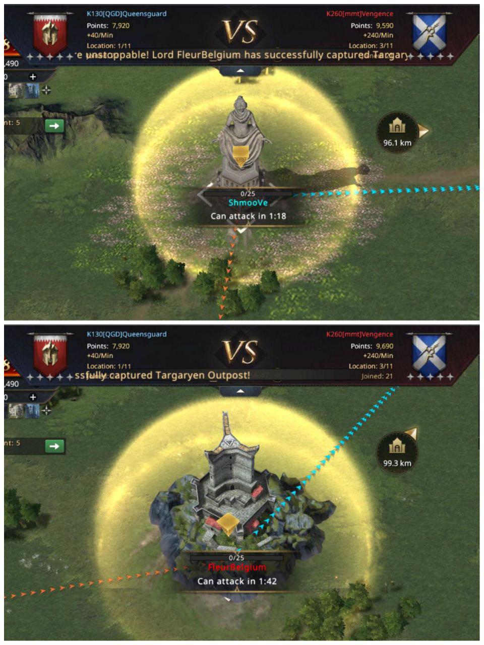 The protection for first capture runs out and without even a second to catch their breath, mmt the Targaryen outpost and Fleur Belgium takes it for them. Even though they’ve taken the outpost, they left the Temple of the Mother scarcely defended with barely any troops in, this allowed ShmooVe to take it for QGD and revive hopes of a perhaps even match. After all, mmt were in front but if QGD could secure the boosts from the Temple and the Tower, there is a chance they can win.
