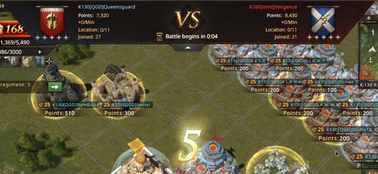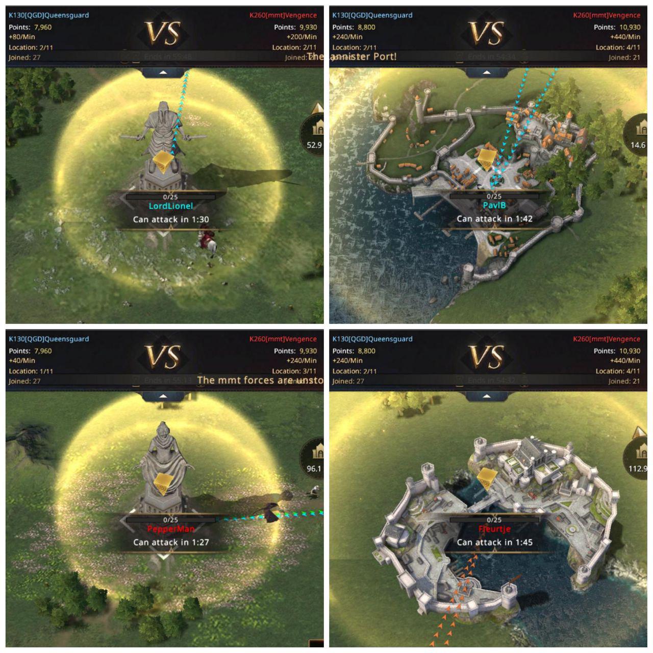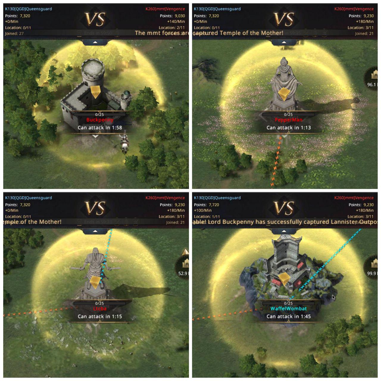 Immediately as they start, mmt takes control of both the Temple of the Mother and the Tower of the Warrior. They also take the Lannister outpost. QGD is left stunned and only able to take the Targaryen outpost thanks WaffelWombat. Horrible start for QGD, they were left behind completely by the incredible speed of mmt. It is a first for QGD, they have met stronger opponents but they usually are able to at least secure a few first captures.