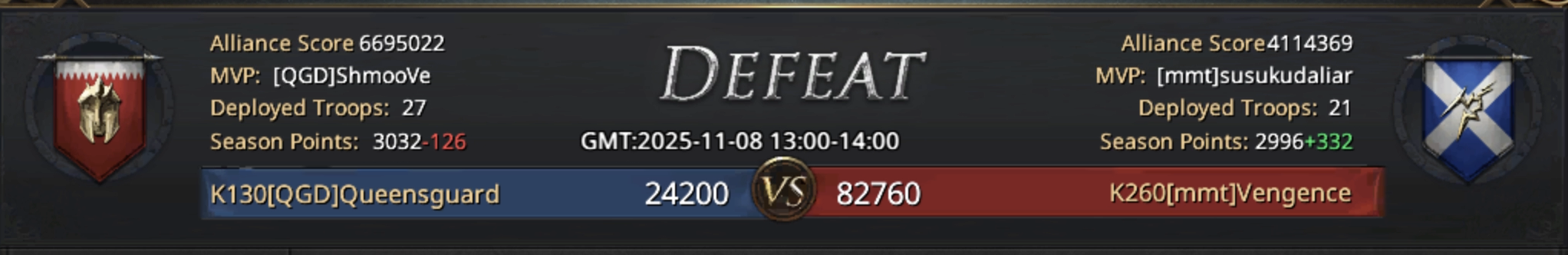 Attention everyone, today’s match of Alliance Conquest comes to an end with a clear victor : mmt. They were able to control the pace of the match and even when bothered by QGD forces their strong and fast responses gave them everything they needed to secure a good 80k win. On the other hand, QGD may have been weaker in comparison to mmt but they tried their best today and actually fought back against them. They still were able to amass over 20k points which is a lot considering the domination of mmt and it says lots about the tenacity of those QGD players. The Lannister port was the embodiment of their hopes and struggle which finally paid off when Gohar I took it and secured it for the rest of the match. It was a good evening. I hope you all have enjoyed today’s game, this was your host, Igris Red, good night !