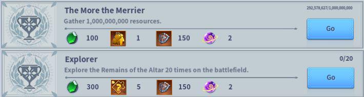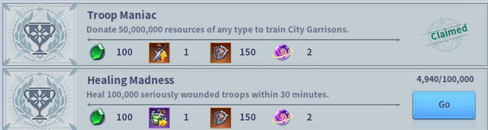 With no guarantee of alt alliances in the same starting zone, much less the same bracket, as your main alliance, naturally, the easiest achievements to complete will be anything to do with cities, towers, training, and healing troops.