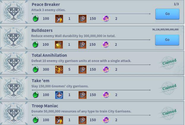 The five you can do in tandem are all city-related. Attacking three enemy cities can be easily done just by attacking three out of the seven available cities in the starting zone. You don’t even have to occupy them. Hitting the walls will count towards the 300 million damage counter needed for another achievement. After getting past the walls, attacking city garrisons a few times should net you the completion of two more achievements. Once your alliance has occupied a city, simply donate 50 million resources to the city to complete another achievement. The most difficult in this bunch will be the 300 million wall damage. You will have to hit cities several times without capturing them.
