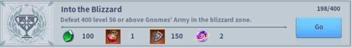 Defeating 400 gnomes in the blizzard zone is probably the only one I would consider medium difficulty. It’s doable and not very difficult, but it requires AP and time. Let’s say you optimize your AP cost per gnome and only require 68 AP per gnome; it would still require about 27,000 AP. This task will give you another two crystals.