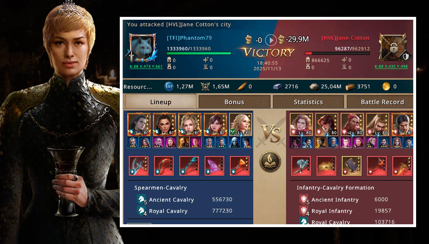 The final blow against Jane Cotton came almost without emotion. Her defense was weakened beyond repair, and Phantom ended the siege quickly, killing 866 thousand troops while losing nothing. He watched the flames rise from the broken towers and felt no pride, no triumph. The fall of Jane Cotton was necessary, but empty. HVL had taken too much from him before collapsing.