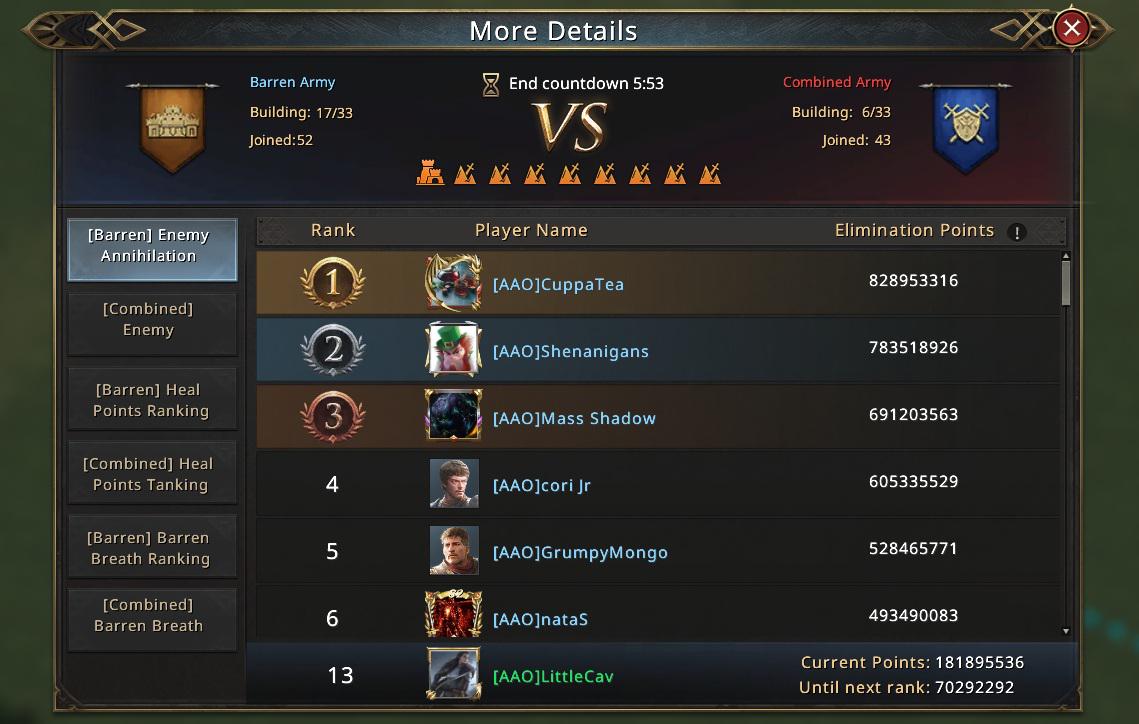 When the match is ready to start, we get Barren Army again. Probably because we are the slightly bigger alliance and the solo side suits us better. Maybe on my main I will end up in Combined Army, which would ruin all my alt training, haha.