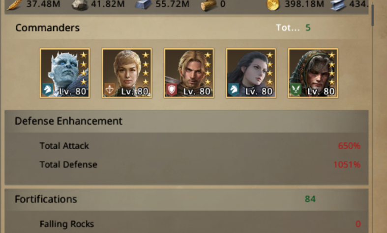 Scouts returning with their findings, Camie, feasting their eyes on, although not a great number of soldiers, the standout in the report was Stereor’s mix commander lineup on their wall. Featuring commanders such as Nightking, Cersi, Leila, Vorian and Sararer, though these are powerful commanders in their own right, the only real synergy these commanders had was with Cersi and Leila, multi-triggering their skills and able to launch devastating wildfire upon Camie’s infantry lineup, not only damaging but disarming their attacks, which can easily strip away a large amount of Camie’s damage. Not to mention the NightKing can revive a great number of lost soldiers into White Walkers, adding to Stereor’s very large defense, which would more than likely exceed twenty million soldiers, Camie thought.