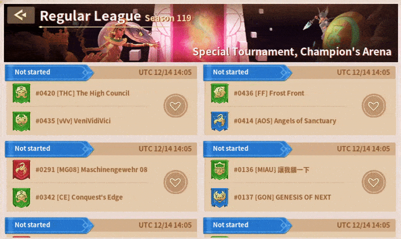 - Server 73’s ARC will play against Server 366’s KE at 14:00 UTC
