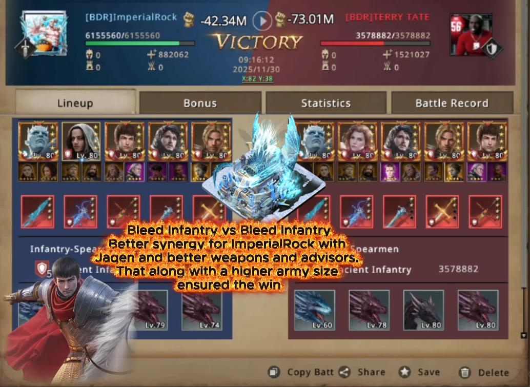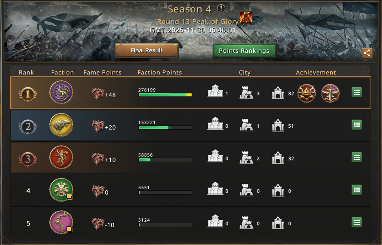 Despite being able to deflect most of the rallies, each of them was chipping away quite some forces from the defenders so it was up to the team to quickly heal them and send reinforcements as quickly as possible to defend against the relentlessly incoming attacks. The rallies were well timed, and they even managed to drop the remaining troops to as low as 3 million, but ImperialRock is one of the strongest warriors on the Westeros and ultimately after tens of minutes of rallies and reinforcing, the City of Glory fell into House Targaryen's hands and that sealed the fate of this round with a few minutes left to fight.