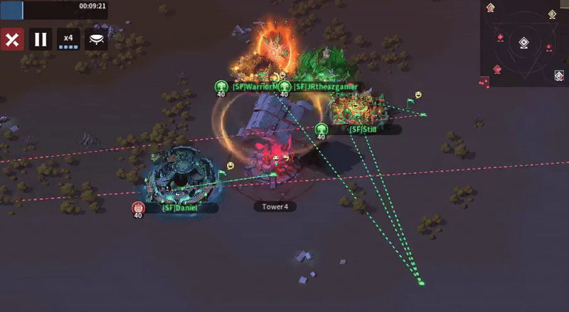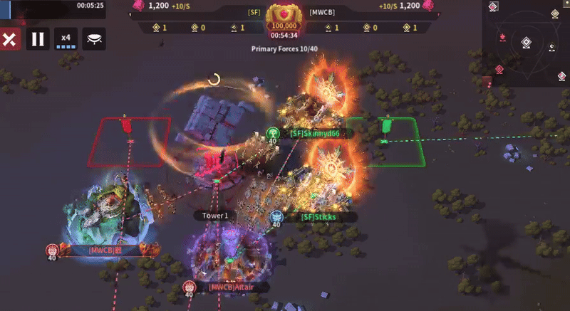 SF stationed two guards at their home tower while MWCB kept only one at theirs. In a small match with limited rosters, assigning two players to home defense is inefficient, as a single guard is sufficient. An enemy cannot meaningfully relocate to a home tower unnoticed until roughly the seven minute mark, so SF was unnecessarily wasting manpower that could have been applied to active objectives.