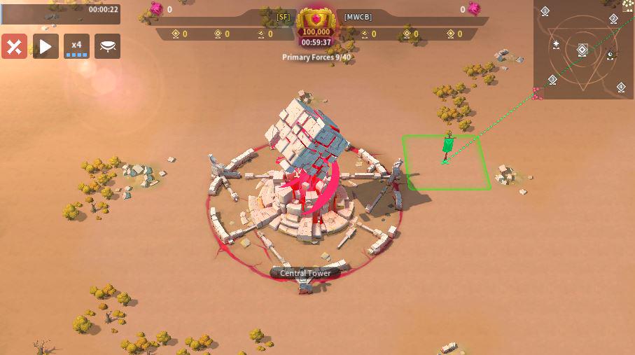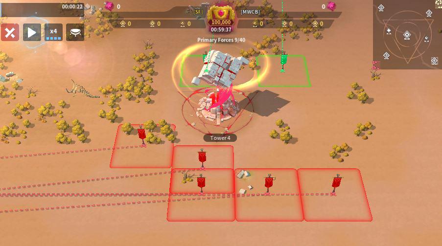Starting at the five minute mark, an SF player relocated to MWCB’s Tower 3 where only one guard was present. The guard failed to destroy the relocation because it landed on the far side of the tower and was out of march range, when the correct response would have been to relocate next to the invader and wait for the relocation timer. Two MWCB players arrived from spawn to help, but they did not rally, allowing the SF player to defend each solo attack. SF attempted to send reinforcements, and while MWCB did a good job blocking those relocations, they missed the better play of destroying them to strand the attackers for several minutes. Eventually, the full MWCB team arrived and zeroed the lone invader. SF returned a few minutes later with multiple players, wiped most of the MWCB defenders, and captured Tower 3 at the 35 minute mark. Although MWCB traded by taking Tower 4, SF had already built a 50,000 point lead within the first 22 minutes, which carried them comfortably to victory.