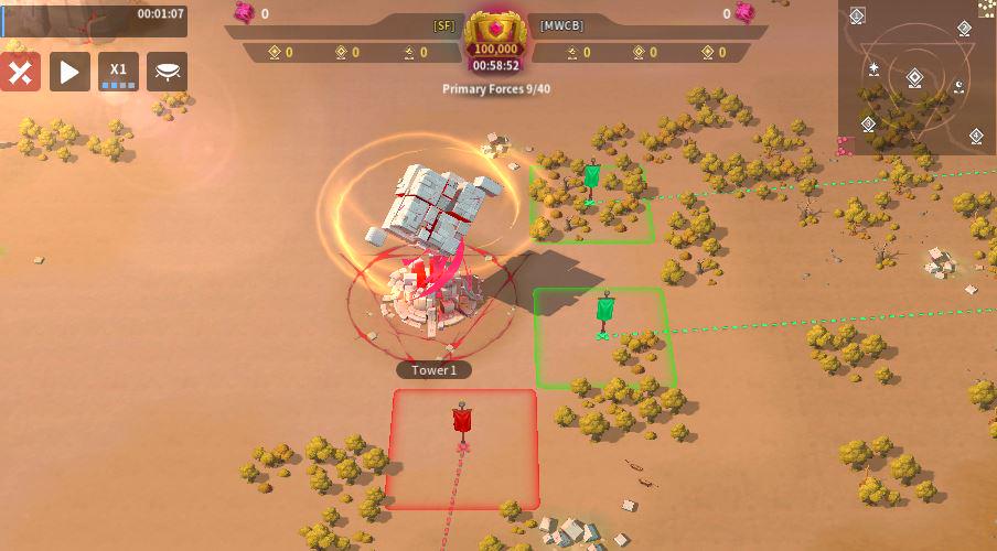 SF opened Tower 1 by launching nonstop solo attacks into the lone MWCB defender. MWCB absorbed many of the hits effectively while waiting for two late teammates to relocate in support, though SF could have sped things up by rallying instead. One MWCB player canceled his relocation and the other failed to garrison the defender, leaving him exposed. SF zeroed the isolated player, had another teammate arrive shortly after, captured the tower at the six minute mark, and finished by zeroing the final MWCB presence.