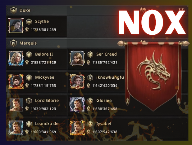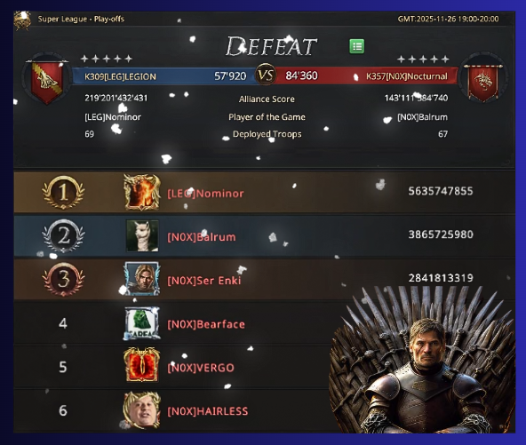 The best fighters of the match were Nominor from LEG who gets the first place of the match followed by Balrum from NOX. Both fighters were crucial pawns in the outcome of the battle with Nominor, who managed to temporarily seize possession of Casterly Rock, turning the tide of the match, and Balrum, who was a real thorn in his side during his sieges.