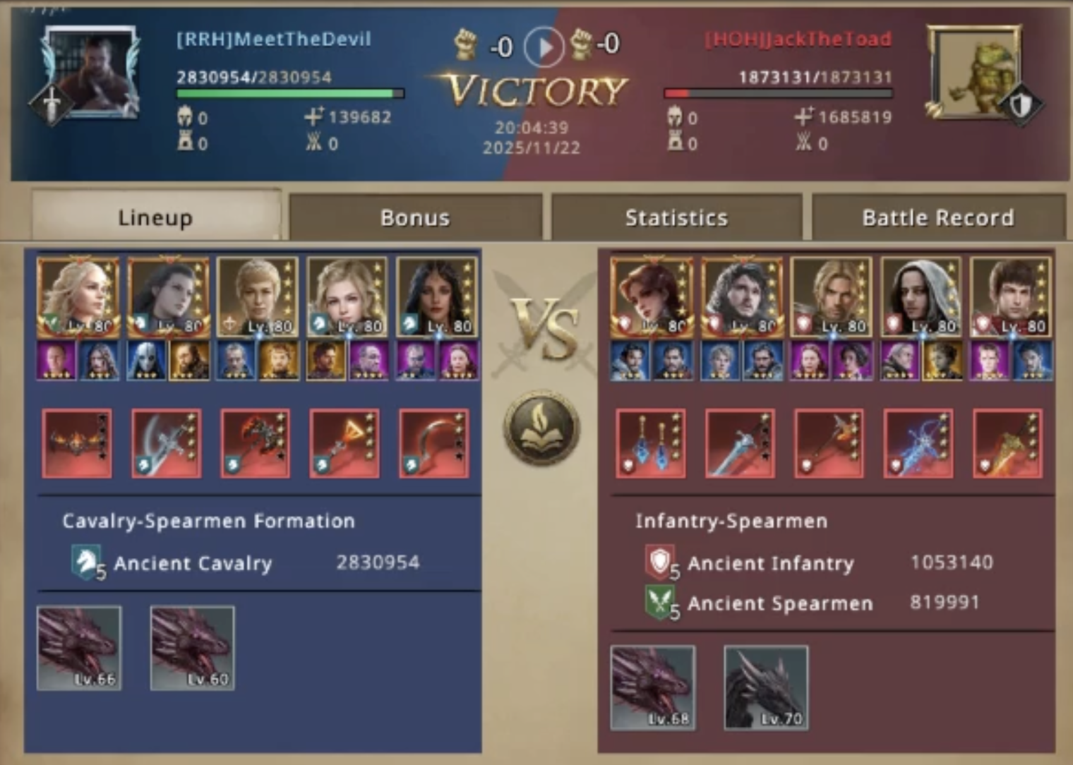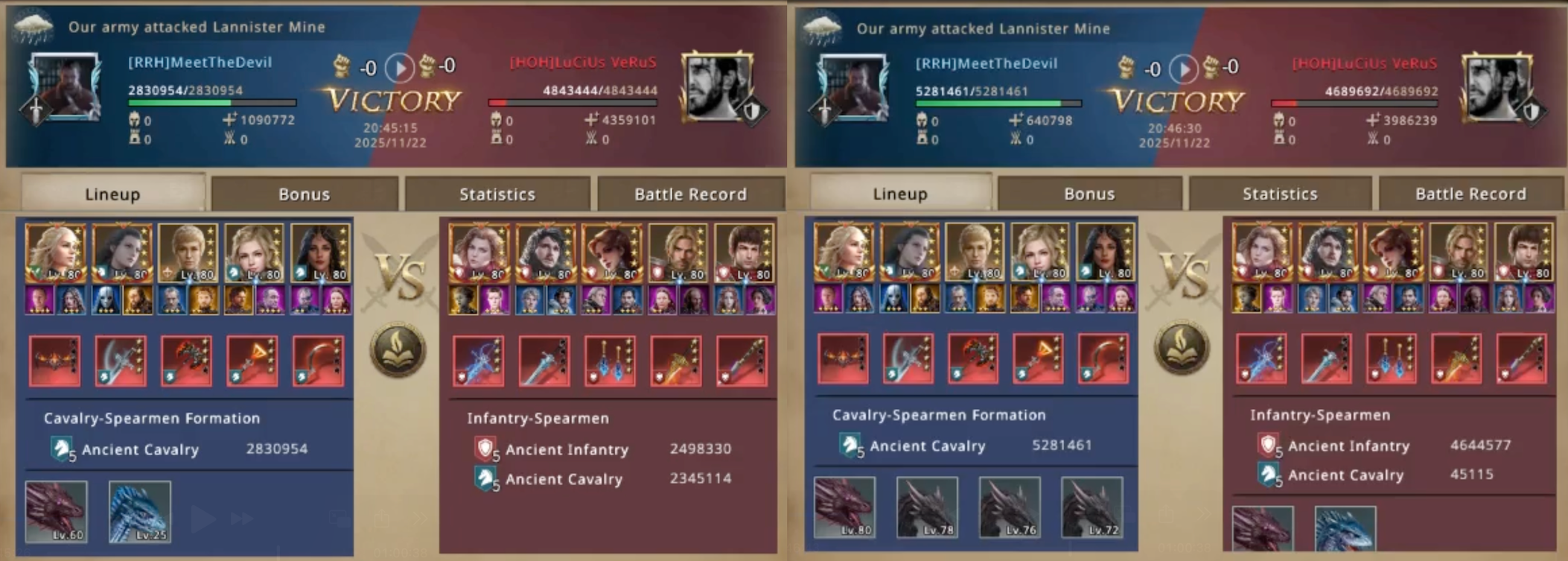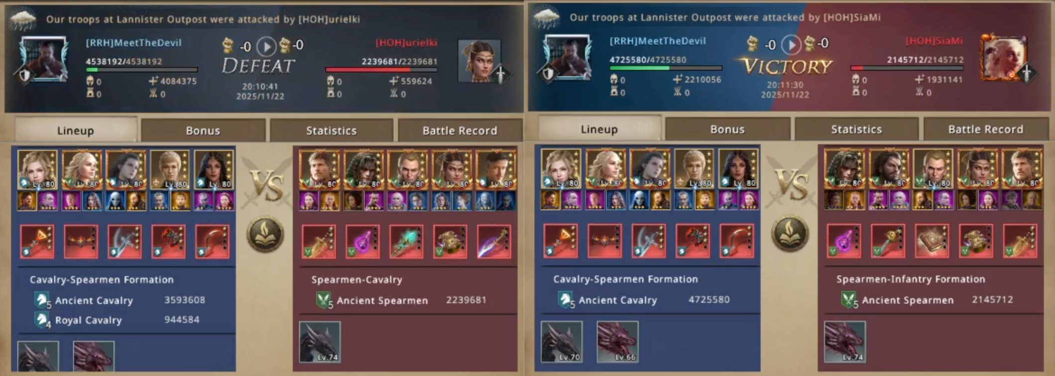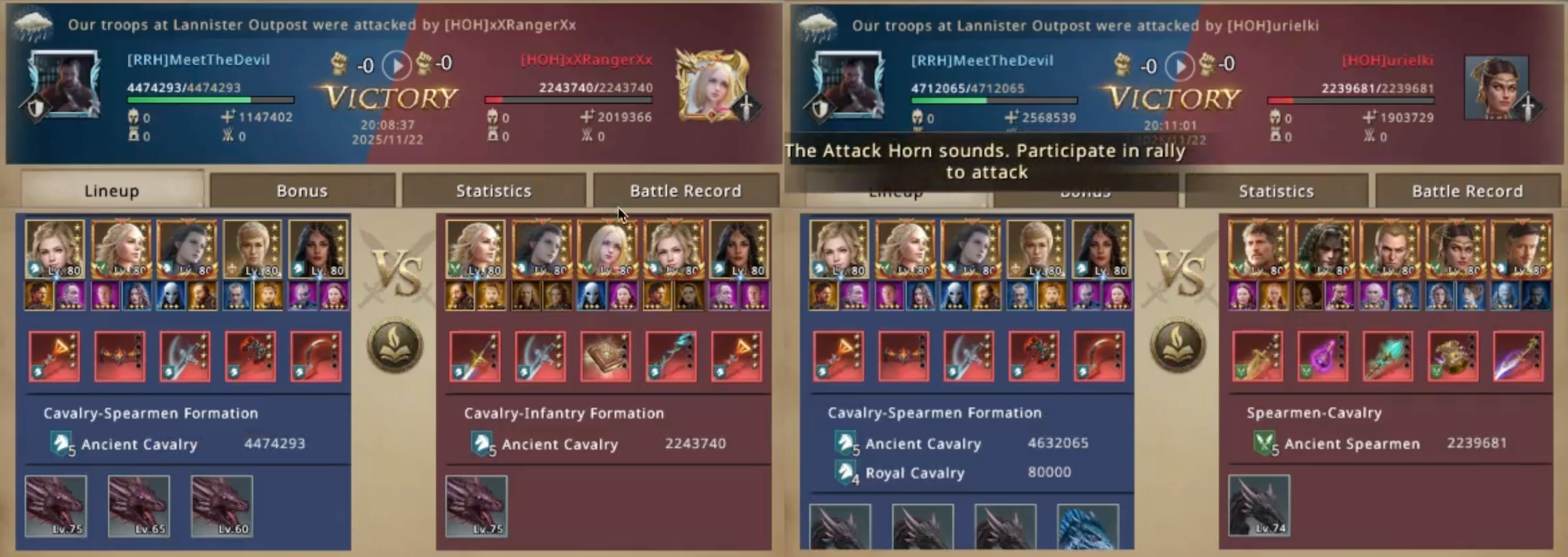 The pressure then shifted directly onto me. Recognizing that I was a fresh lead, HOH’s Spearman rally leads began targeting my building with a series of aggressive solos. It was a brutal trial by fire. I held my ground, winning some of the battles with narrow margins and losing others as my troop counts dipped. Even when I won, the cost was high; the constant hammering meant we had to endlessly refresh the reinforcement, draining our troops and keeping us in a state of perpetual crisis.