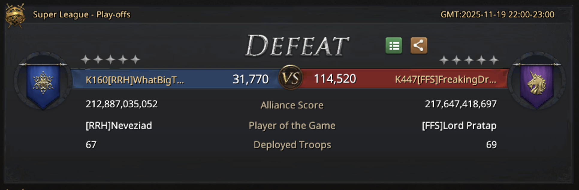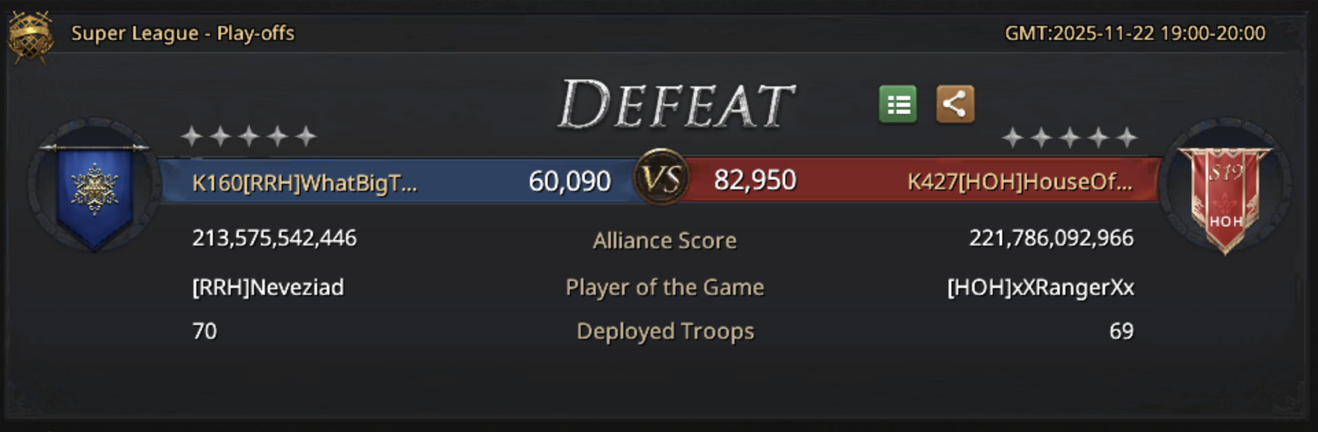 The elimination from the UC playoffs was a bitter pill for RRH to swallow, especially after such a heroic effort. This match against HOH was a testament to how competitive Alliance Conquest has become, where a victory or defeat isn't decided by a lack of power, but by a few seconds of reinforcement timing and the luck of a final march. HOH’s ability to survive five consecutive waves of rallies with only a handful of marches left showed the incredible discipline of their defenders. For RRH, and for me in my first outing as a rally lead, it was a painful but invaluable lesson. In the playoffs, "almost" is the same as "nothing." We left the battlefield with our heads high, knowing we pushed a top-tier alliance to their absolute limit, but the sting of that narrow defeat would fuel our hunger for the seasons to come.