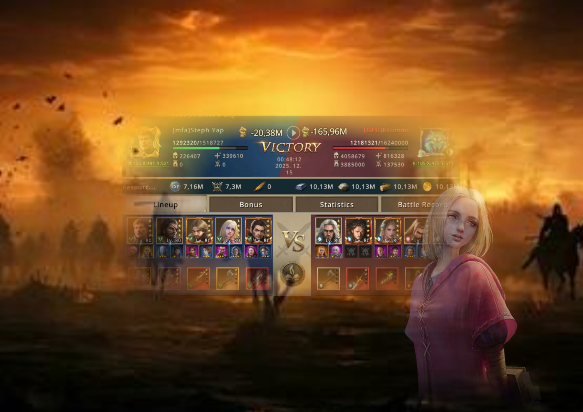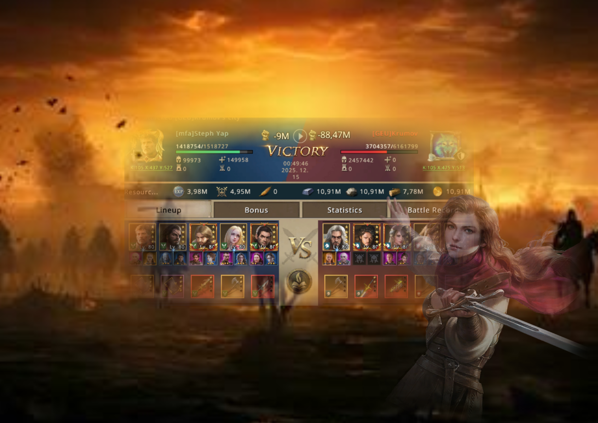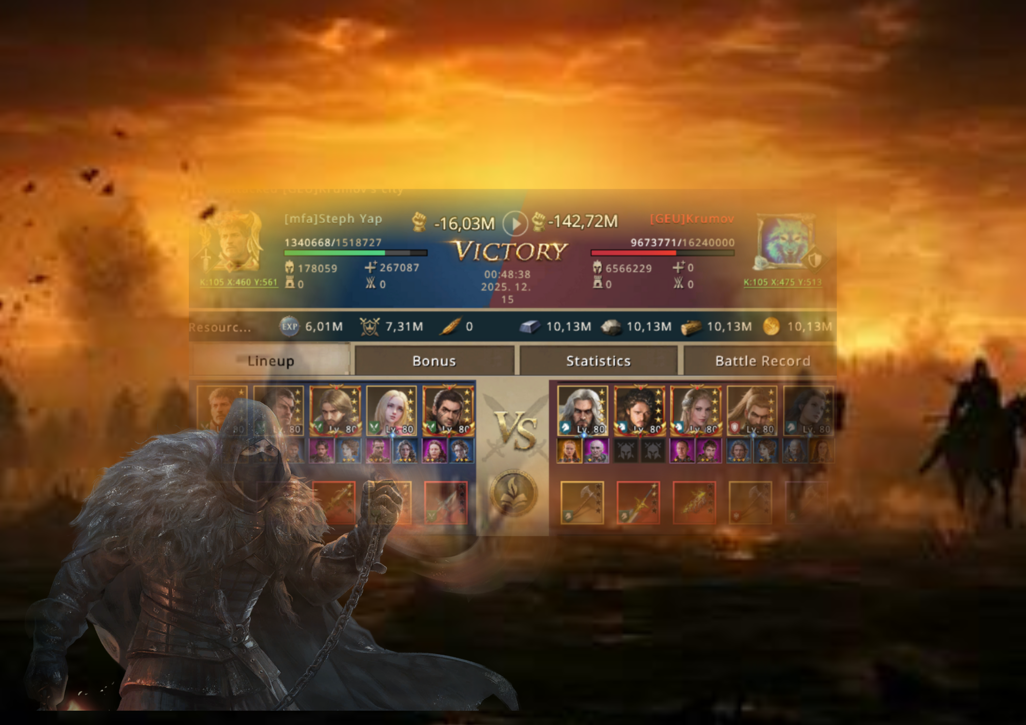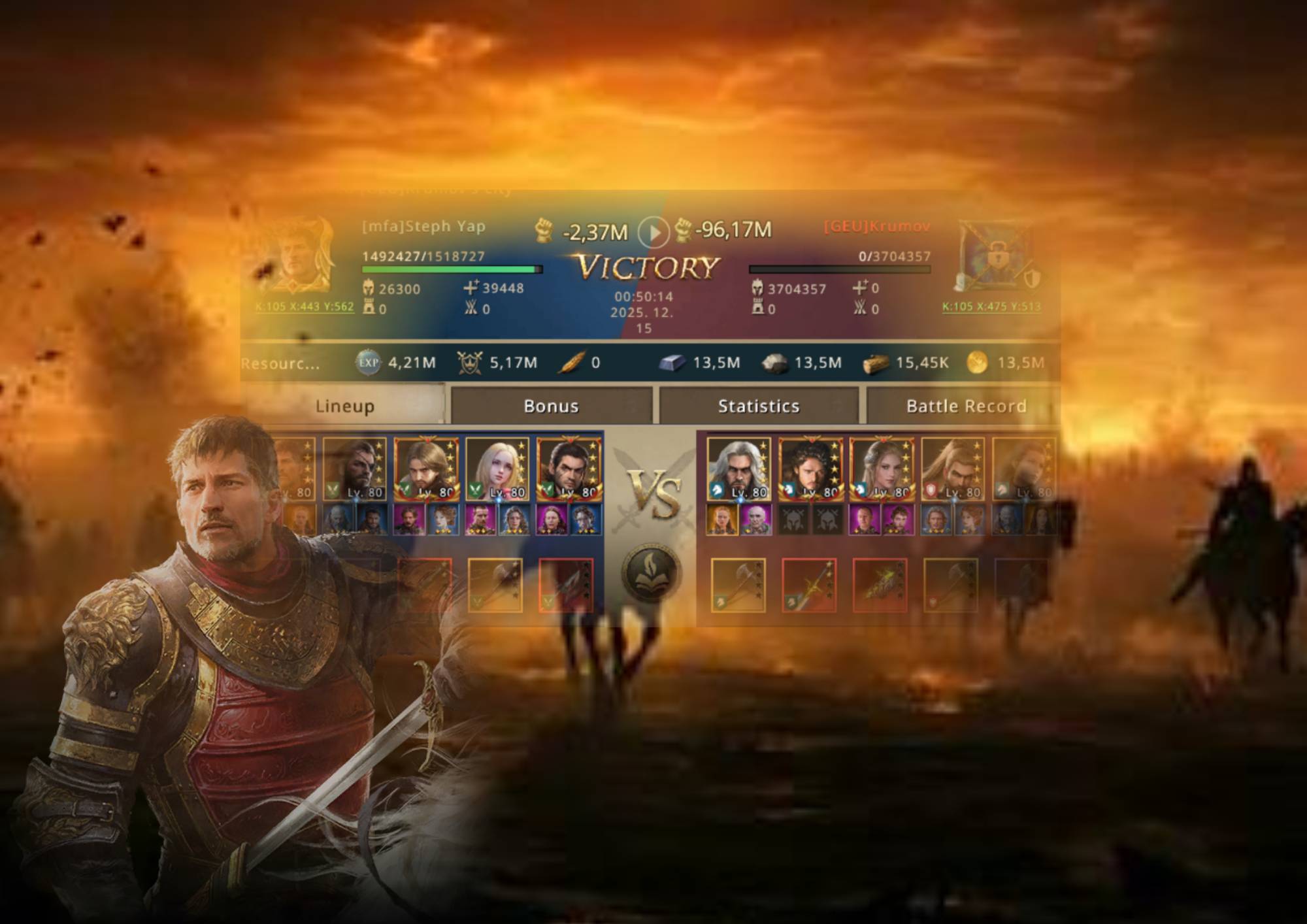 Five Solos over Kingdom 105 Kingdom 105 lay open beneath a clear sky, its borders quiet, almost careless. There was no tension in the air, no warning signs that a storm is approaching from the drak. That was how these hunts always began. Silence before the storm. Steph Yap watched the terrain from his high wall´s that gave a good position to watch over the Kingdome, spear units already aligned behind him. No banners were raised. No speeches were given. This was not a campaign meant to be remembered by cheers. It was meant to be remembered by blood. The target was Krumov of the GEU alliance. A castle filled with variets of bows, cavalry, infantry, spears, T1 to T4 all layered now exposed. Padding mixed with real force. A structure that looked busy, not prepared. Worse time, that the shield was gone. No reinforcements waited nearby. No allies moved in response. Krumov stood alone, whether by arrogance or mistake no longer mattered. Five solo attacks were prepared. No rallies. No delays. Ruthless efficiency would decide the outcome.