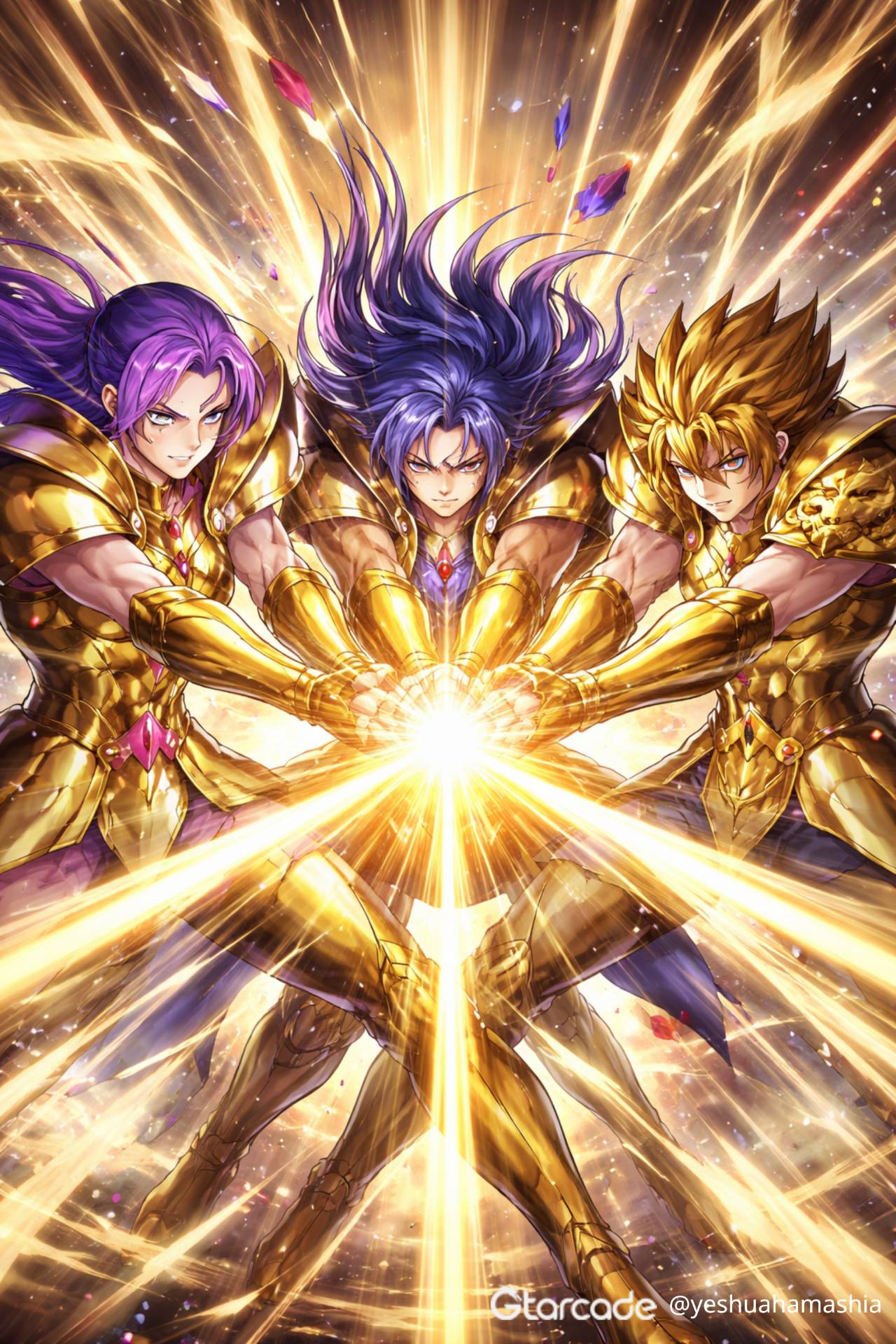 The trio Athena Exclamation, formed by Mu of Aries, Aiolia of Leo, and Milo of Scorpio.