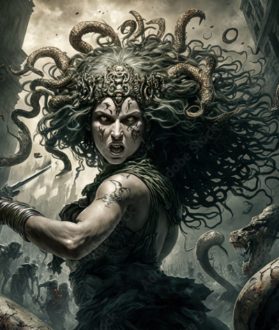 Medusa hissed sharply, pain flashing across her hand as the creature tore free from the half-petrified armor. She steadied her breath and shifted her focus, not freezing but shaping. The ground beneath the beast hardened in a widening circle, stone answering her will instead of resisting it.